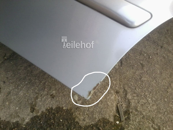 Optischer Zustand: eine Delle (roter Kreis) und zwei Kleinere (schwer zu fotografieren), an der Ecke unten leichter Flugrost (weißer Kreis, nur Außen, Innenfalz kein Rost), ansonsten normal, Alter antsprechend (Bitte beachten Sie, das es sich um eine subjektive Sicht unsererseits handelt, wenn Sie nicht sicher sind, dann rufen Sie uns bitte an)